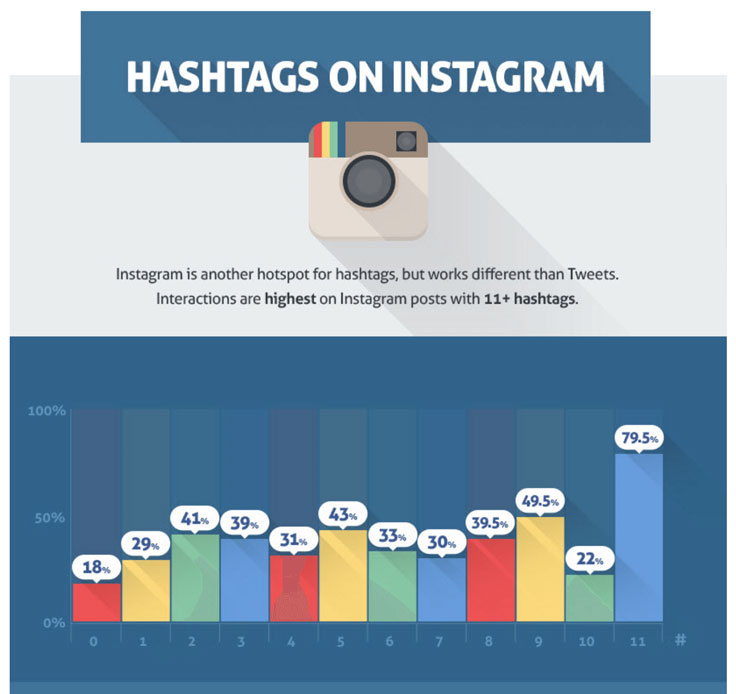 Dengan menggunakan 11 atau lebih hastag berarti memiliki peluang 442% lebih banyak keterlibatan dibanding tidak menggunakan hastag, dan penggunaan 1- 10 hastag akan menggandakan keterlibatan.