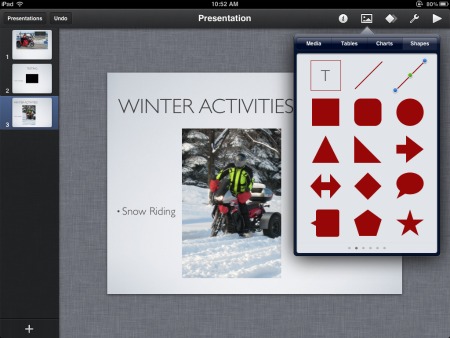 Keynote Apple dapat dibeli sebagai produk yang berdiri sendiri, atau sebagai bagian dari iWork suite produktivitas Apple, dan mungkin salah satu yang paling intuitif, mudah digunakan. Menurut penggunanya melalui perangkat lunak alternatif PowerPoint ini kita bisa membuat presentasi mengesankan dengan Keynote tanpa menghabiskan waktu menggali melalui menu atau mencari template yang belum oleh orang lain. Keynote memiliki besar built-in tools grafis untuk mengedit dan tweak gambar masuk ke presentasi Anda, dengan mudah mendukung video dan film pada slide atau sebagai bagian dari presentasi Anda, mendukung dokumen PowerPoint jika Anda perlu untuk membumbui presentasi orang lain, dan bahkan memungkinkan Anda mengontrol presentasi Anda dari perangkat iOS atau memproyeksikan presentasi melalui video keluar dan melihat catatan Anda dan slide mendatang di layar Mac Anda.