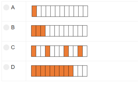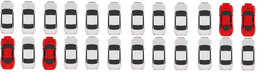 Saat ini banyaknya mobil merah (kotak coklat) adalah 4 dari total 24 mobil (kotak) pada gambar. Agar banyaknya mobil merah menjadi 1/4 bagian dari keseluruhan, maka banyaknya mobil merah harus sejumlah 6/24, sehingga butuh ditambahkan dua buah lagi.